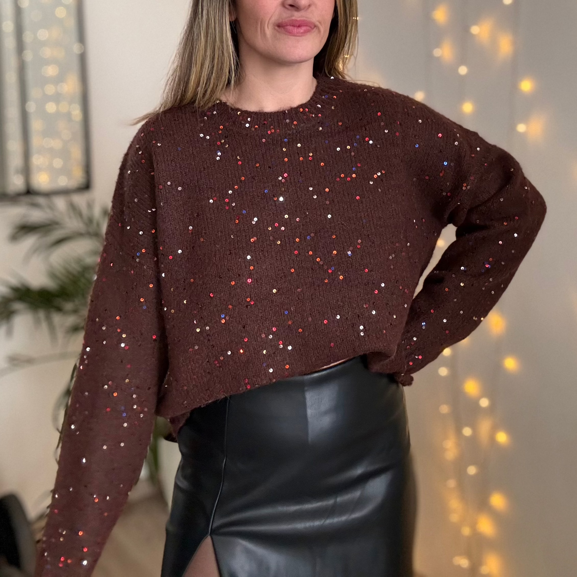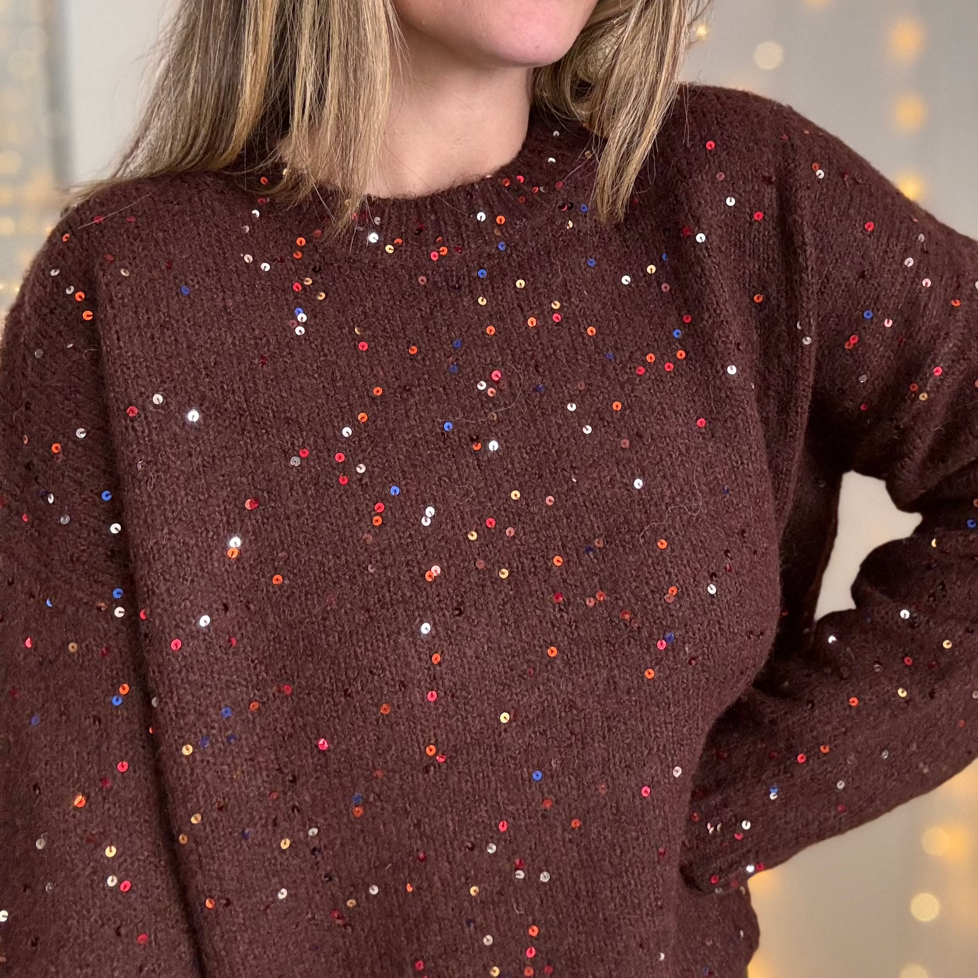 - Pull chocolat avec des sequins colorés